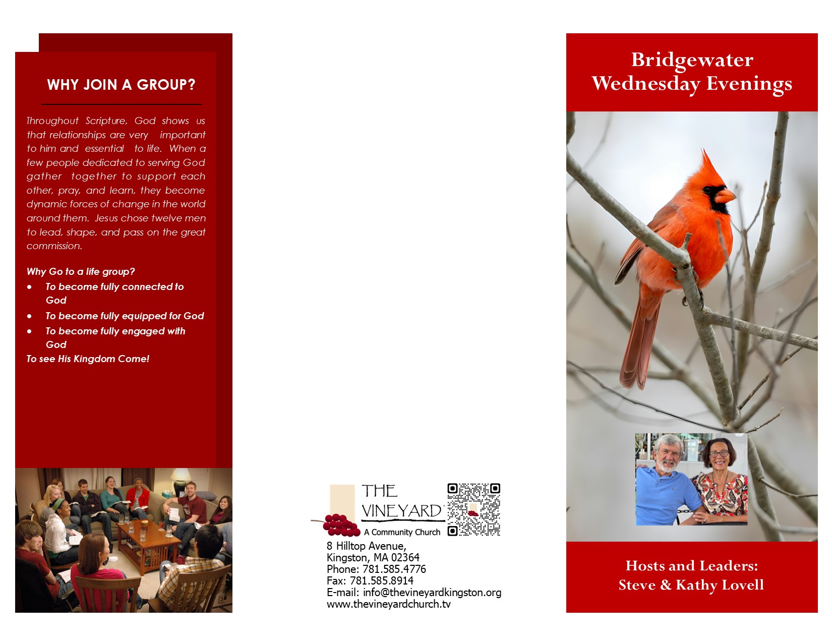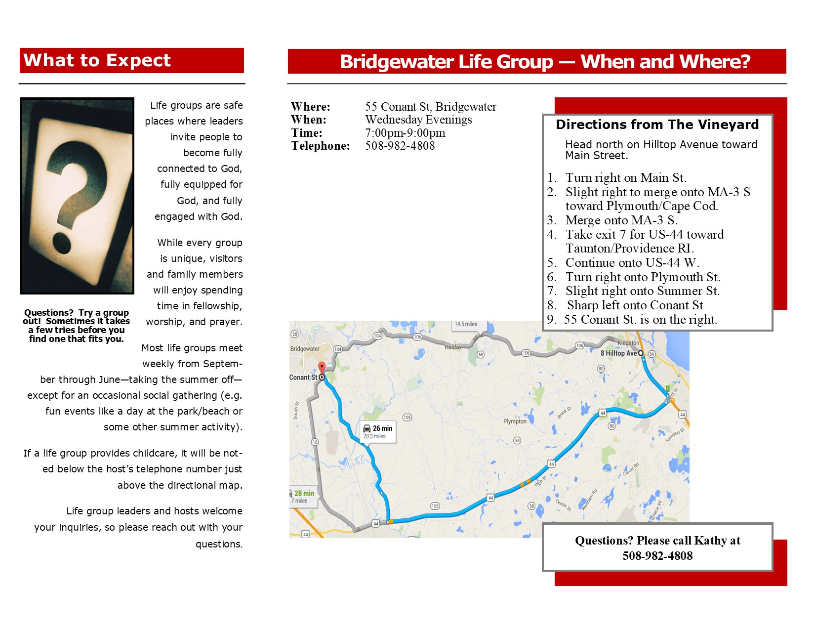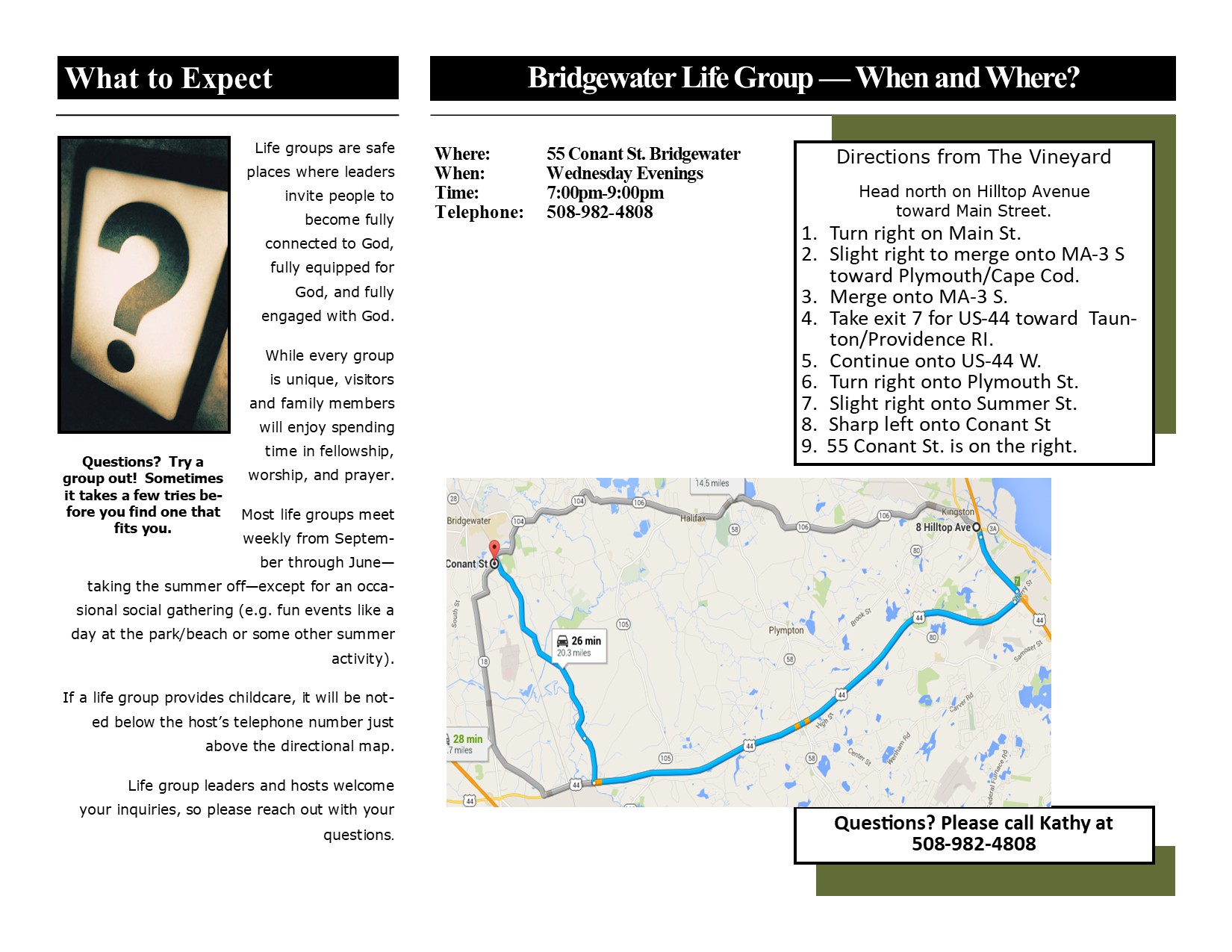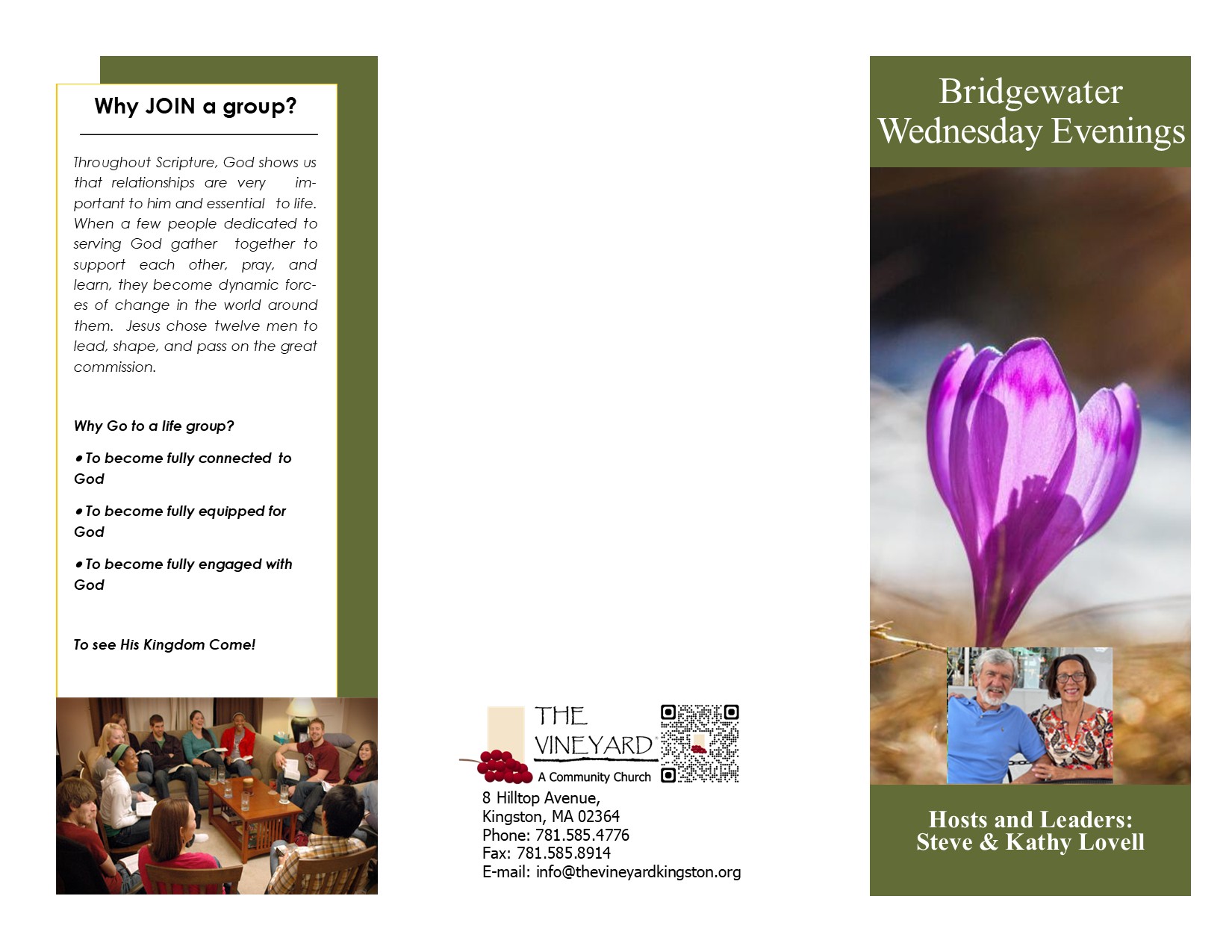 Bridgewater All are welcome to join us. Please call or text Kathy Lovell for more information: 508-982-4808 Group Information: Address: 55 Conant St. Bridgewater Wednesday Evenings 7:00pm-9:00pm Leaders and Hosts: Steve & Kathy Lovell